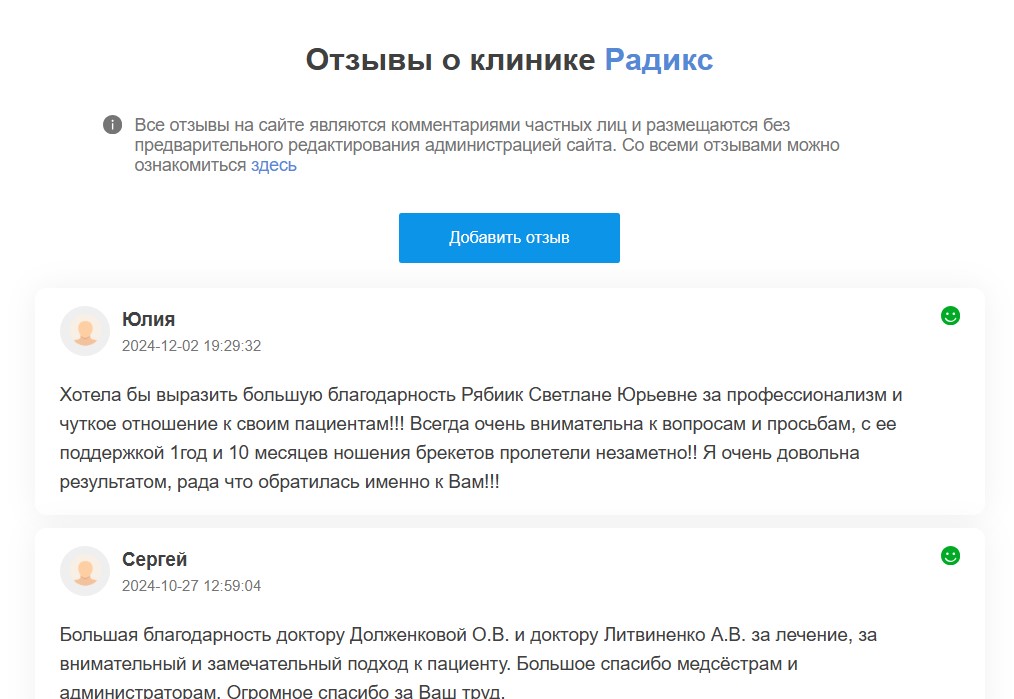 Рекламодатели могут бесплатно подключить функцию модерации отзывов в настройках продвижения, чтобы скрывать нежелательные комментарии посетителей портала. В этом случае в разделе отзывов будет указано, что они модерируются представителями клиники. При отключении продвижения на портале модерация автоматически отключается, скрытые отзывы снова будут опубликованы.